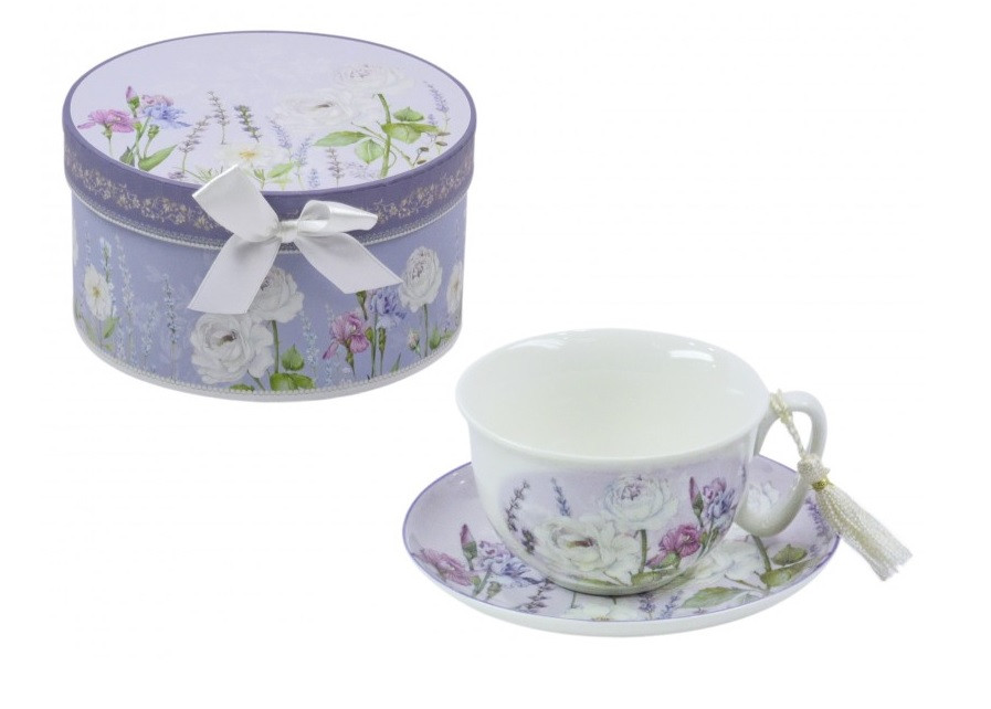Teáscsésze alátéttel díszdobozban lila-fehér virággal